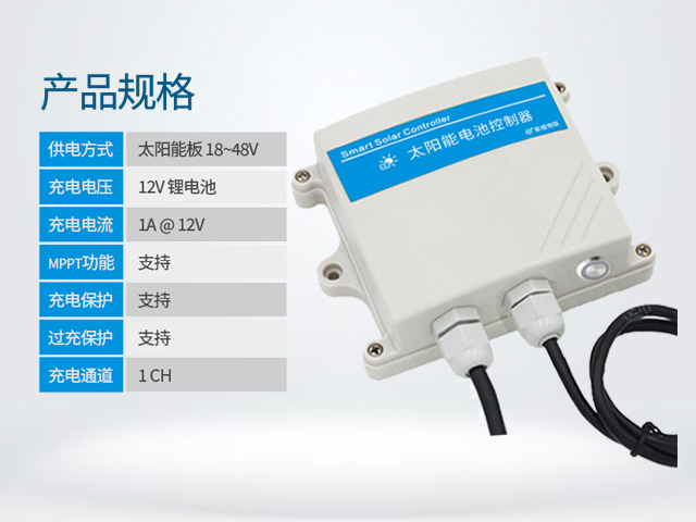 太阳能充电控制器是连接太阳能电池板和电池组之间的设备,太阳能板的产生的电能,通过控制器转化成适合外部设备使用的电压,此外控制器还可以确保对电池组进行正确充电并防止过度充电。可广泛应用于农业物联网设备供电或者其他户外用电设备供电的应用场景。